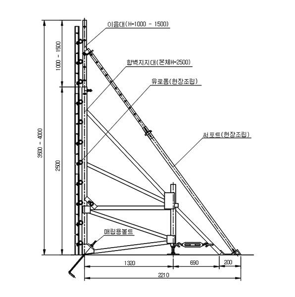1. 합벽구간 작업시 콘크리트 압력으로 밀려나는 부분을 지지 2. 일체형으로 시공 및 철거가 간편하여 인건비 절약과 정밀 시공이 가능